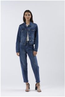 Giubbino denim realizzato in una tela comfort. placchette personalizzate a decorare le spalle. manica lunga. chiusura con bottoni a vista dorati.
