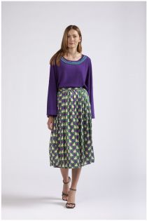 Gonna a ruota lunghezza al ginocchio realizzata in saglia di viscosa stampata. chiusura con zip laterale.