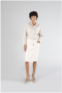 Gonna midi realizzata in tessuto bull denim stretch. chiusura con bottoni visibili e spacco sul retro della gonna. capo che si adatta a occasioni casual con t-shirt e scarpe basse.