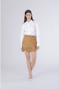 Minigonna in ecosuede dal design femminile caratterizzata da elegante laseratura decorativa sul fondo. morbida al tatto valorizza la silhouette ed è ideale per look chic e contemporanei. la modella è alta 171 cm e indossa la taglia s. vestibilità: regular.
