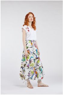 Gonna lunga dal gusto gipsy con balze increspate e vita elasticata. Disponibile in tre varianti di stampe esclusive.