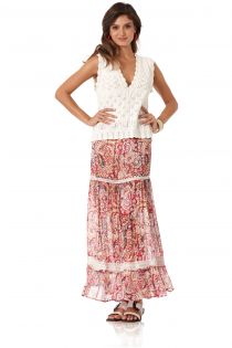 Gonna lunga a balze realizzata in georgette di viscosa stampata in due fantasie differenti. La passamaneria rifinisce e arricchisce i tagli.