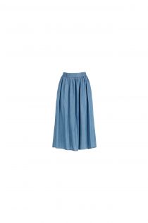 Gonna lunga in tencel effetto jeans. Il capo presenta dei contrasti di tessuto stampato e un elastico sul retro del cinturino per facilitare la vestibilità.