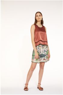 Gonna midi in satin di viscosa stampato. La stampa è un foulard piazzato con contrasti tinta unita sull'orlo e al cinturino