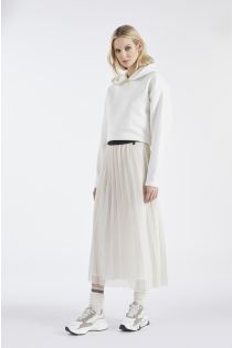 Gonna plissettata realizzata in un brioso tessuto georgette con dei delicati tocchi di lurex