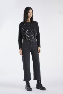 Pantaloni in tela denim superstretch con vestibilità culotte e particolare applicazione di strass in tono che creano un gessatura