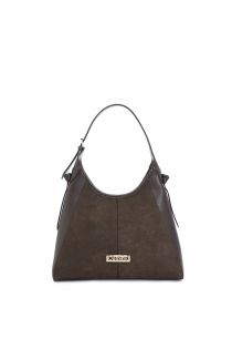 Hobo in materiale granoso ed effetto suede sul quadrante davanti. attacco manici con nodo e placchetta logo in metallo. chiusura con cerniera.
