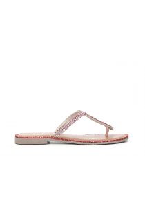 Infradito con microstrass sfumati e una particolare infilatura in rafia a contrasto lungo il perimetro del soletto in pelle.