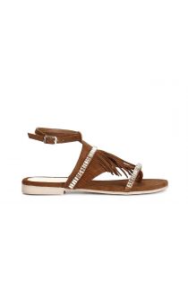Sandali infradito in camoscio con frange e catena strass. fodera e soletto sono in pelle. il tacco è alto 2 cm. comodi da indossare e facili da abbinare.