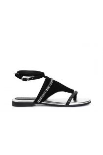 Sandali infradito in camoscio con frange e catena strass. fodera e soletto sono in pelle. il tacco è alto 2 cm. comodi da indossare e facili da abbinare.