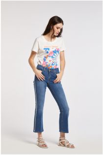 Jeans cropped flare in tela superstretch con elegante catena di strass sui fianchi