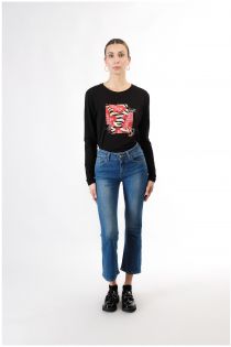 Jeans denim in tela super stretch dalla vestibilità cropped flare. passanti in vita cinque tasche chiusura con bottone logato a chiodo e zip. etichetta sul retro con logo