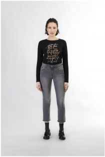 Jeans denim in tela super stretch dalla vestibilità cropped flare. passanti in vita cinque tasche chiusura con bottone logato a chiodo e zip. etichetta sul retro con logo