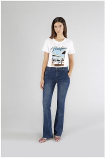 Jeans modello anna dalla vestibilità flare. realizzati in tela superstrech. il capo è realizzato per avvolgere la figura e valorizzare le forme. cinque tasche chiusura classica e passanti per cintura.