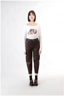 Jeans dalla vestibilità cocoon in gabardina laminata. cinque tasche e chiusura con bottone e zip nascosta. capo dalla nota contemporanea di un classico dell'abbigliamento. aggiunge originalità e glamour al tuo outfit.