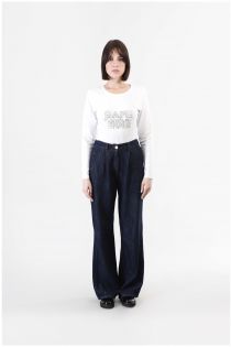 Jeans dalla vestibilità super wide con vita posteriore elasticata. capo realizzato in una tela denim ferma morbida e fluida. jeans che accompagna i tuoi movimenti morbidamente con una linea ampia perfetta come base per creare il tuo stile casual.