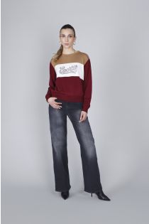 Maglia girocollo color block in caldo filato misto lana con scritta “sportif” arricchita da strass. un capo casual e luminoso perfetto per look comfy e grintosi. la modella è alta 173 cm e indossa la taglia s.