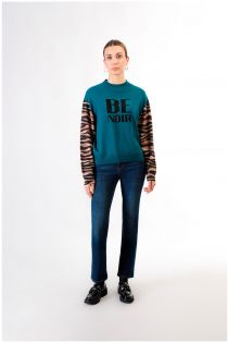 Maglia cropped con collo a ciclista in caldo e morbido filato mistolana. punto maglia rasato e lavorazione jacquard per il nostro slogan "be noir" impreziosito da strass sapientemente applicati. disponibile in una variante bicolor con maniche stampate.