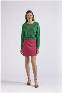 Maglia girocollo a maniche lunghe. capo realizzato in filato misto cotone e viscosa. applicazione di fiori crochet sul davanti.
