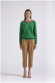 Maglia girocollo realizzata in filato misto cotone e viscosa. la scollatura è decorata con una passamaneria esclusiva con lavorazione crochet impreziosita da strass e catena oro.