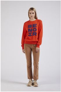 Maglia girocollo realizzata in un caldo e soffice filato misto angora. la maglia riproduce il nostro slogan "be noir" in colore a contrasto. una delicata linea di strass incornicia la scritta.