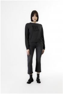 Maglia in caldo e morbido filato mistolana. punto maglia rasato e lavorazione jacquard per il nostro slogan "be noir" impreziosito da strass sapientemente applicati. disponibile in una variante bicolor molto di tendenza e di due varianti colore in tinta unita.