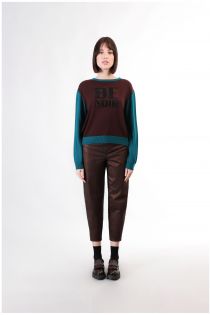 Maglia in caldo e morbido filato mistolana. punto maglia rasato e lavorazione jacquard per il nostro slogan "be noir" impreziosito da strass sapientemente applicati. disponibile in una variante bicolor molto di tendenza e di due varianti colore in tinta unita.
