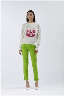 Maglia girocollo realizzata in un filato misto cotone e viscosa. la maglia riproduce il nostro slogan "be a flower" in colore a contrasto realizzato con la tecafènoirica a intarsio. la scritta è impreziosita da microstrass.