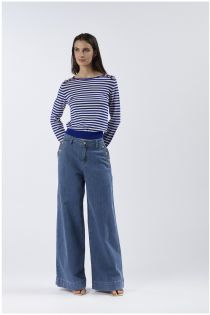 Maglia girocollo a righe con maniche lunghe e motivo di bottoni metallici dorati sulle spalle. maglia realizzata in filato misto viscosa.