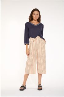 Maglia in filato di viscosa dalla vestibilità morbida con dettagli lurex ai polsi e allo scollo. Proprio lo scollo, ampio e a V, diventa protagonista ed illumina il modello.