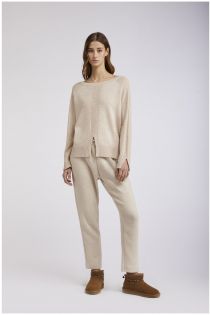 Maglione con scollatura a barca realizzato in filato mistolana. particolare e sofisticato motivo traforato.
