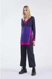 Caldo ed avvolgente maglione con scollatura a v e abbottonatura laterale realizzato con un mix di colori e di filati
