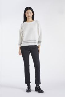 Caldo ed avvolgente maglione ampio con girocollo in filato misto angora e lurex. Decori multicolor sul fondo e sui polsini