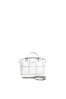 Mini bag sfoderata con intreccio con fasce larghe chiusura con zip in cima e manici con attacco con finta fibbia dotata di tracolla optional.