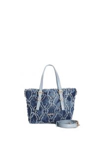 Mini tote in denim con dettagli sfrangiati decorata con rivetti e strass. manici e tracolla regolabile e removibile in materiale liscio per un tocco di eleganza casual.