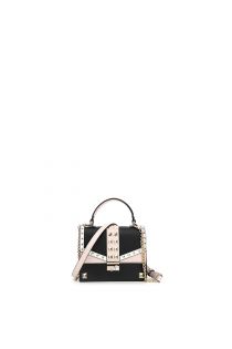 Minibag con patch multicolore, file di borchie piramidali e accessorio chiusura con strass