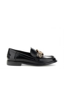 Mocassini da donna in similpelle spazzolata nera con morsetto a catena dorato. eleganti e versatili. soletto in pelle e tacco basso da 2 cm. perfetti per look formali.