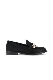 Mocassini da donna in pelle effetto cavallino nero arricchito da elegante morsetto in metallo smaltato. soletto in pelle e tacco basso da 2 cm per uno stile chic e confortevole.