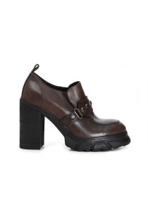 Mocassini in pelle con tacco alto e passante con borchie. Plateau in gomma decorato con un motivo che richiama il mondo dello sport.