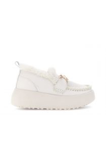 Mocassini in pelle bianca con accessorio dorato. interno foderato e soletto in pelliccia sintetica. comodi e caldi con suola platform da 4 cm. perfetti per look invernali chic.