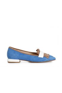 Mocassini in pelle scamosciata con frangia a decoro. tacco fasciato in pelle laminata alto 15mm.