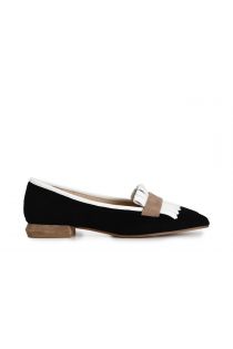 Mocassini in pelle scamosciata con frangia a decoro. tacco fasciato in pelle laminata alto 15mm.