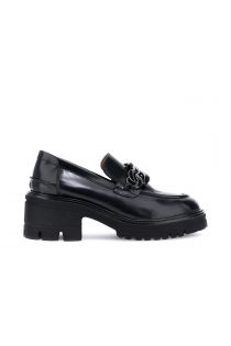 Mocassini in pelle spazzolata con maxi catena in tono lucido. fondo carrarmato con plateau da 2,5 cm e tacco alto 5,5 cm. fodera e soletto in pelle. eleganza grintosa per look decisi e contemporanei.