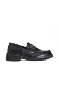 Mocassino da donna in similpelle con doppia fibbia e microborchie cromate applicate. il soletto è in pelle.