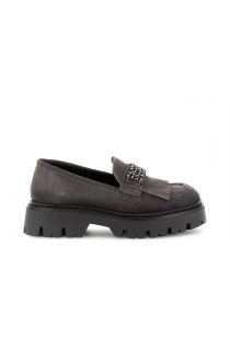 Mocassino in pelle scamosciata con frange ed accessorio gioiello. il soletto è in pelle. la suola carro armato in materiale extralight slancia la modelleria e la rende iper attuale.