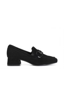 Mocassino da donna in camoscio con morsetto. il soletto è in pelle. tacco spesso 40 mm.