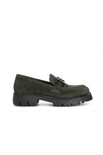 Mocassino da donna in pelle scamosciata con morsetto. fodera e soletto sono in pelle. plateau alto 25 mm. tacco da 40 mm.