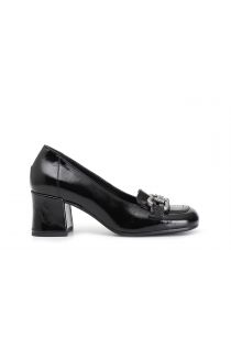 Mocassino da donna in vernice con morsetto sulla tomaia e soletto in pelle. calzatura comoda dallo stile innovativo e raffinato oltre che molto femminile. la punta e il tacco sono squadrati.