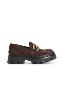 Mocassino da donna in pelle scamosciata arricchita da un particolare morsetto sul passante. il soletto è in pelle. modello versatile e dinamico ideale per completare moltissimi outfit.