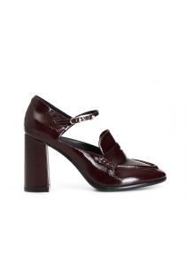 Mocassino da donna in pelle verniciata con cinturino e fibbia personalizzata. tacco squadrato 88 mm. il soletto è in pelle. calzatura molto versatile e chic per interpretare con stile i look da ufficio e per il tempo libero.